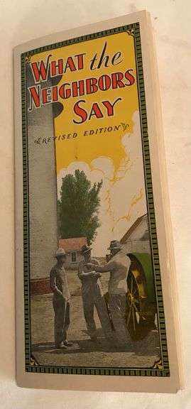 What the Neighbors Say - Pocket Brochure - for the John Deere Model D Tractor - 19 page folding pocket brochure. Has testimonies from farmers who have purchased the John Deere Model D Tractors from Nebraska, Iowa, South Dakota. Really kind of a neat John Deere Advertising Piece. - The brochure is loose at the staples - otherwise condition is nice.