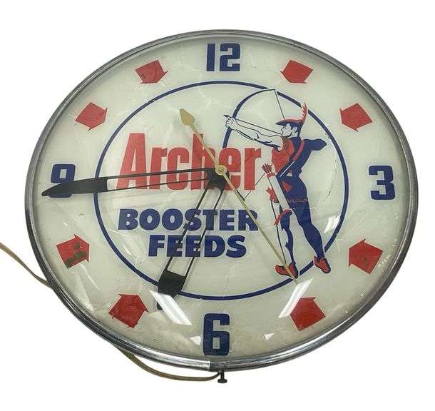 Pam Clock Co. - Electric Clock - Does Light Up and Operate. — We do see some cracking in the backing of the Archer Decal when this clock is illuminated. Measures 14” In diameter