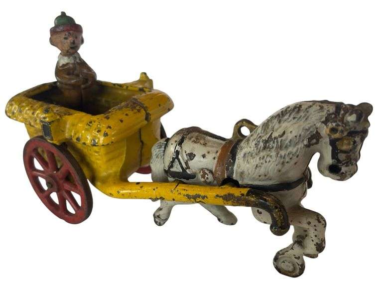 Vintage Arcade Mfg. Cast Iron Wicker-style cart pulled by a horse features Chester Gump from the popular “The Gumps” comic strip. - Measures 7” x 4”