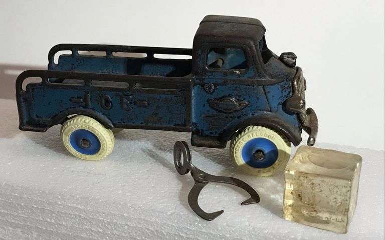 Early Cast Iron “Ice” Truck - Tires are marked Arcade - Truck measures 6 3/4” x 3” - also features a plastic ‘block of ice’ and Ice Tongs