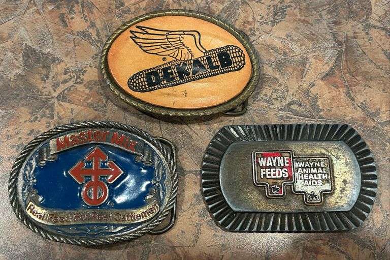 LOT 195 - (3x) Advertising Belt Buckles - Master Mix, Wayne Feeds, Dekalb