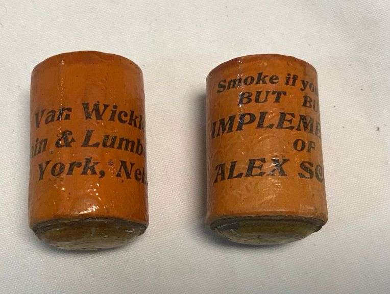 Neat old vintage Smoking Pipe Bowls - (1) is from Van Wickle Grain & Lumber - York, Nebr.” - the other one we are unsure of town “Somke if you must But Buy Implemets from Alex Scott” - Selling both to go